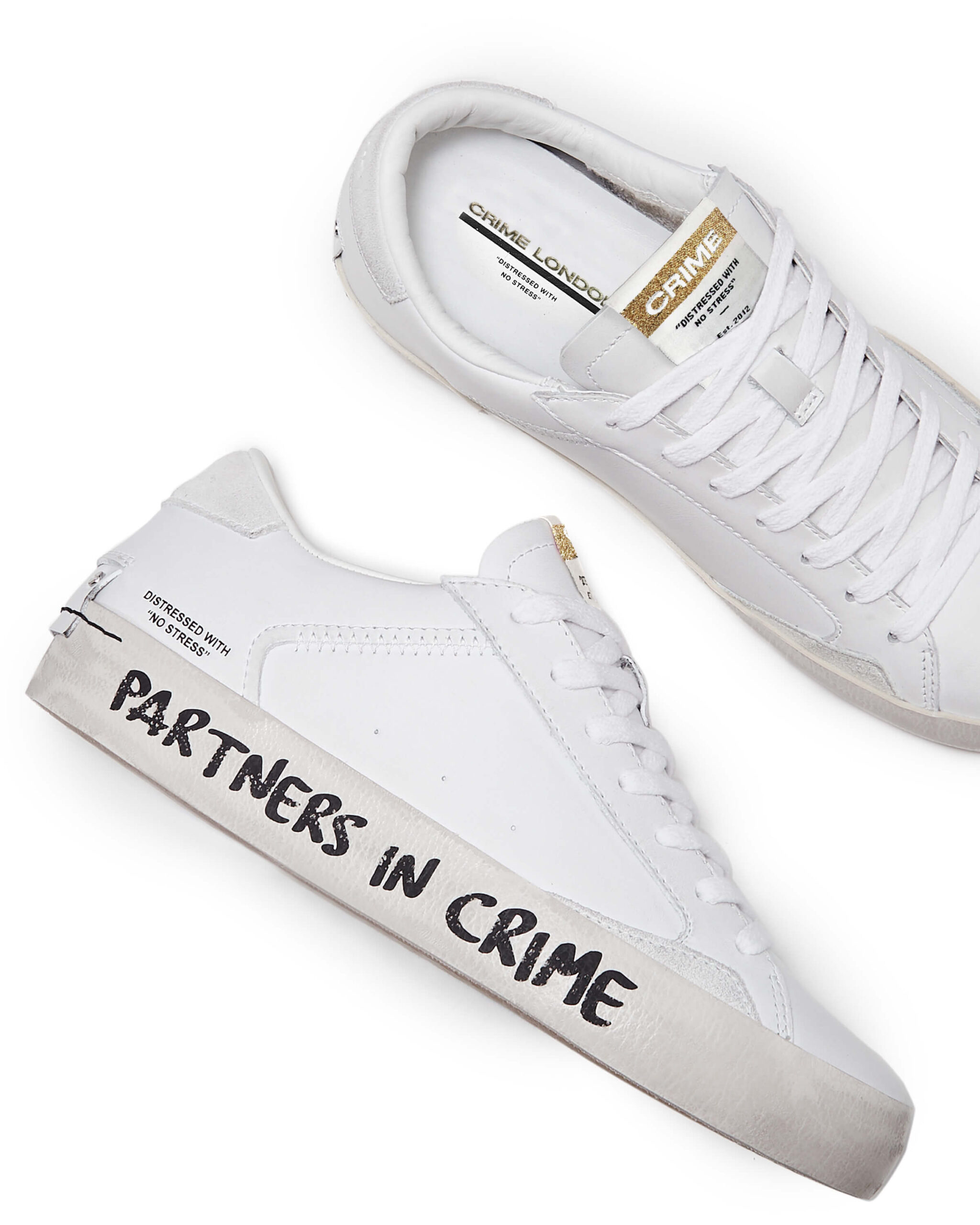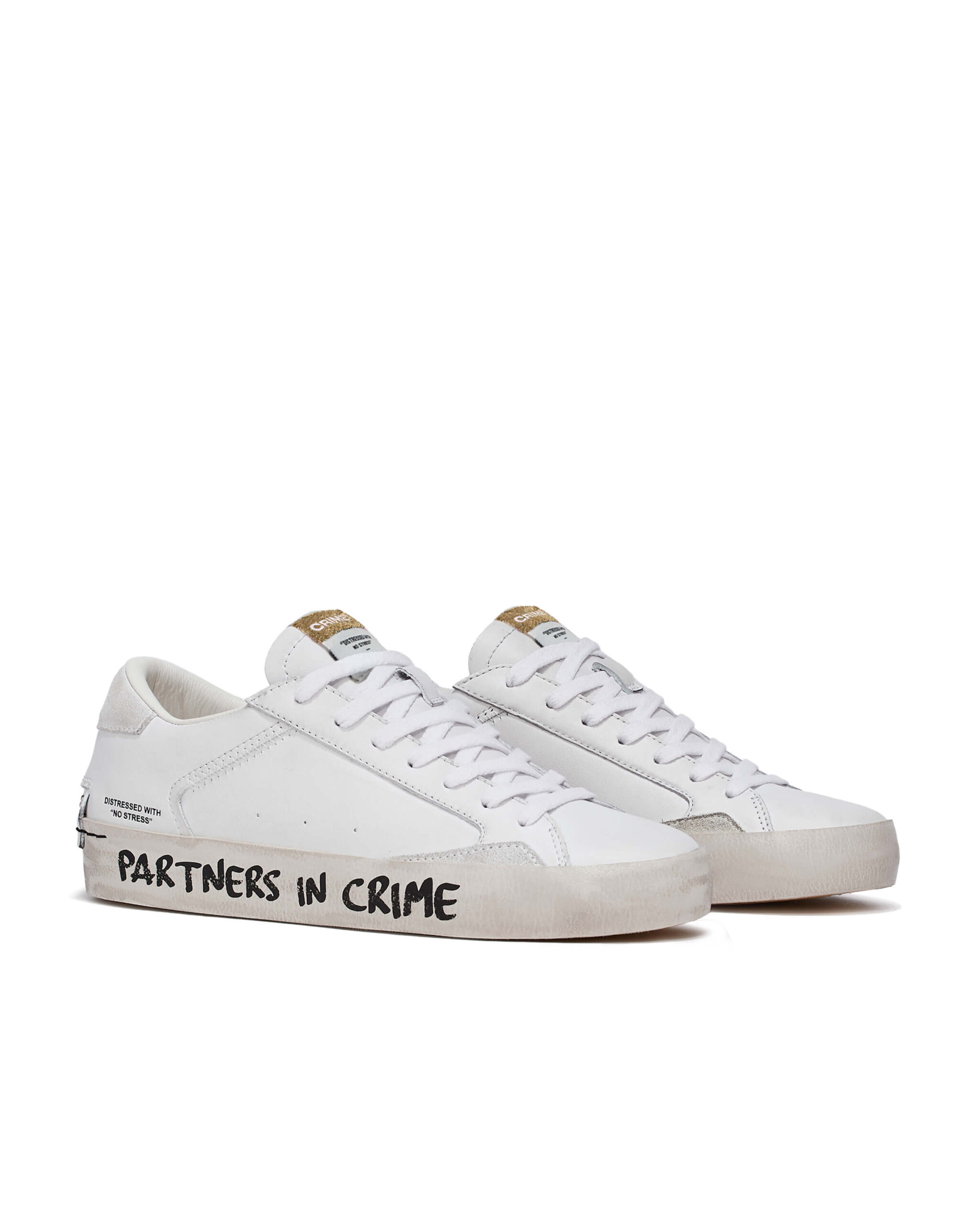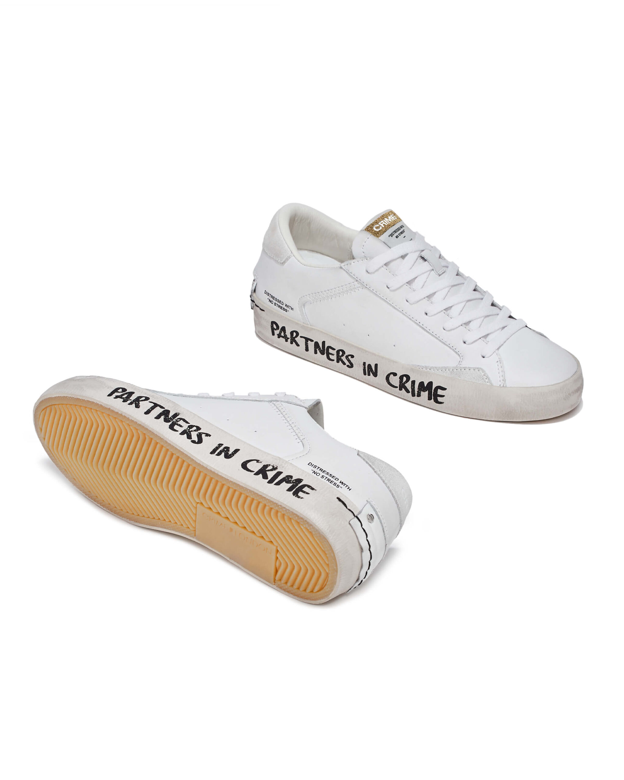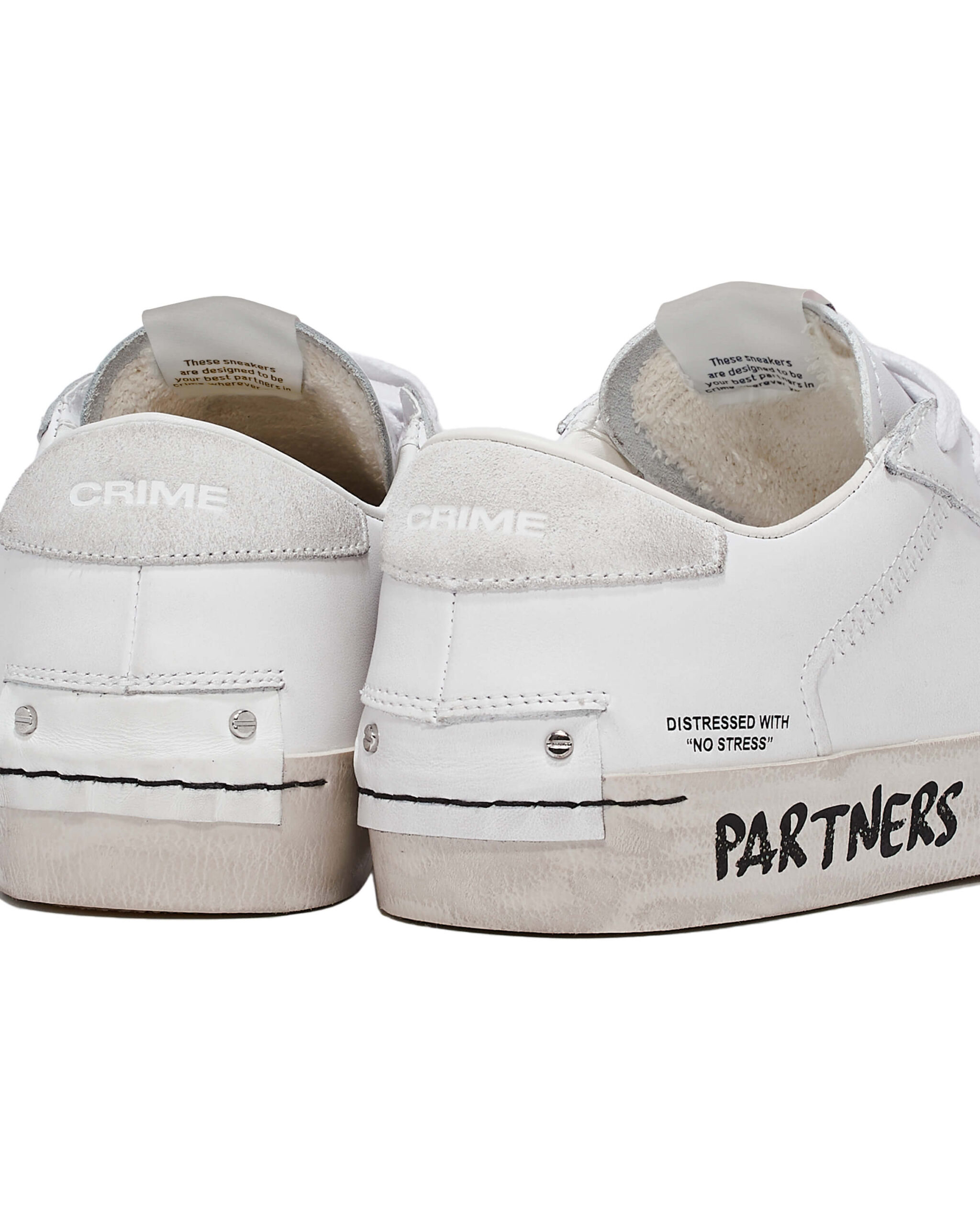 "DISTRESSED WITH NO STRESS" CRIME LONDONのブランド発祥の背景にあったアイコンモデル。 『DISTRESSED』。 ブランド誕生のきっかけとなったシューズコレクション。 どんなスタイルにも合うデイリースニーカーを作ろうというアイデアから誕生したモデル。使用したバルカナイズソールと2cmのレザーカップインソールを採用。加えて常に最高級のイタリアンレザー素材を使用。ヒールカップの クラシックなレザーに2つのスタッズディティールはブランドのアイコンであり、靴のウィズサイドにある「マッドガード」は歩行中に靴の最も繊細な部分を強化しデザイン性に落とし込んでおります。